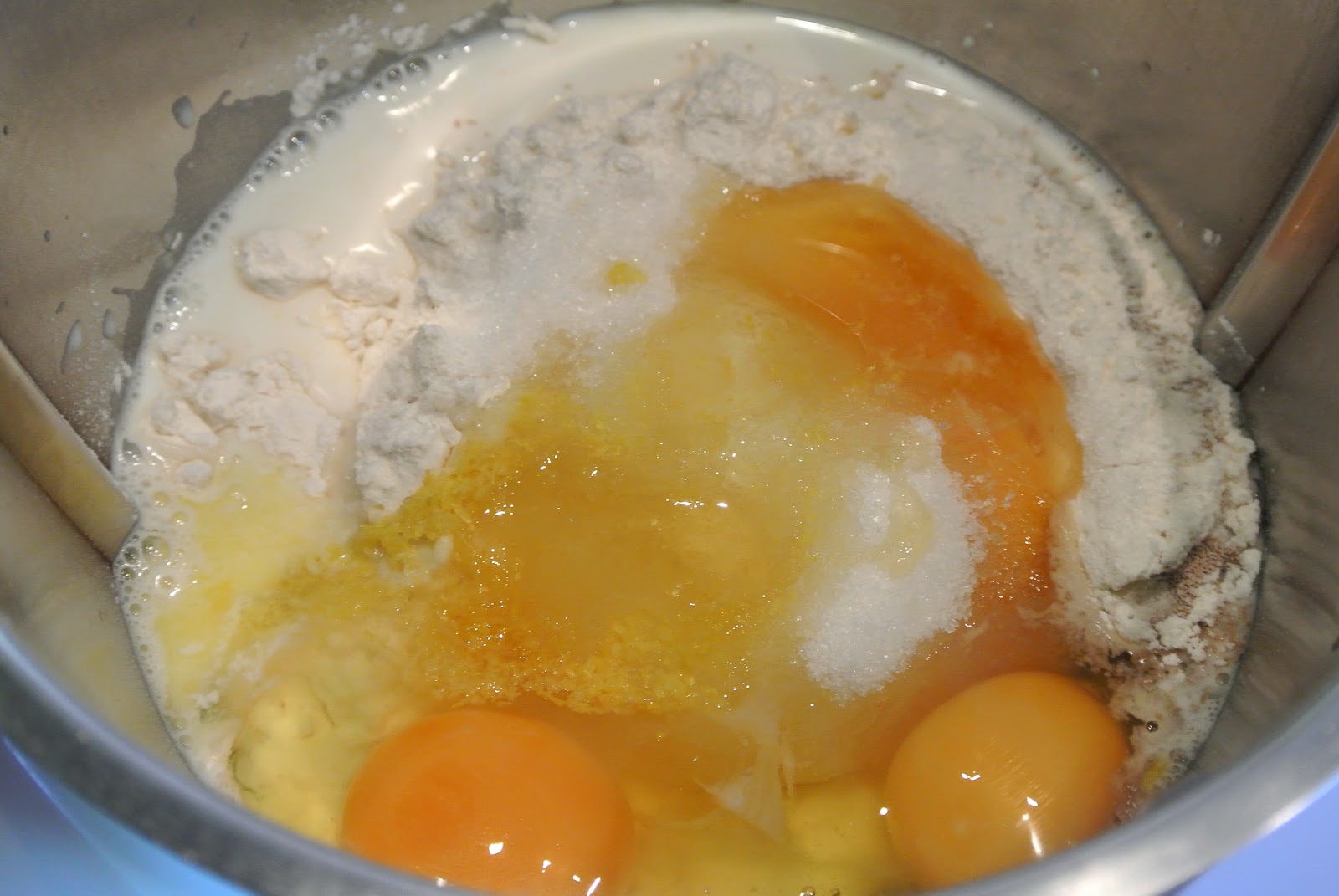 Mettete nell'impastatrice la farina, il lievito di birra e il latte a temperatura ambiente, le uova, lo zucchero, il miele e gli aromi macerati. Azionate la macchina. Io con il bimby ho impostato velocità spiga per 10 minuti.